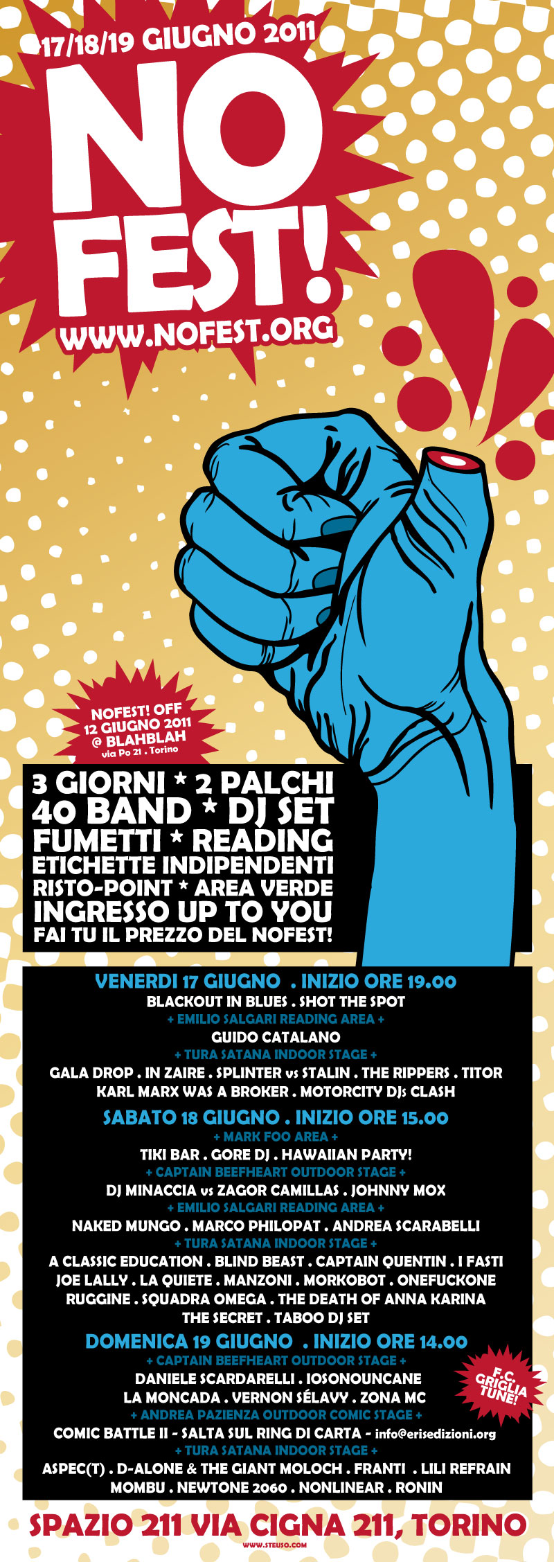 Il NOFest! 3 sarà il crocevia di suoni, etichette e musicisti provenienti da Washington D.C., Lisbona, Los Angeles, Ottawa, Berlino, Parigi e dall’intero stivale, siamo orgogliosi di portare sul palco il nuovo progetto di Joe Lally, bassista dei Fugazi, che presenterà il nuovo disco targato Dischord-Tolotta Records e gli straordinari portoghesi Gala Drop, sodali di Panda Bear, ed è con altrettando entusiasmo che annunciamo l’esibizione di The Secret che incidono per la Southern Lord, etichetta di Sunn O))) e Earth, o di band dal respiro internazionale come Mombu (nuovo progetto voodoo di Luca Mai degli Zu), A Classic Education, Ronin, In Zaire, Squadra Omega,La Quiete, Aspec(t) o fuoriclasse come Ruggine, Morkobot e Zona MC.